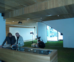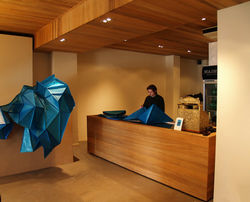 ![]() Preparing for the inauguration of the Waiwera flagship store. WAI means "water" in local Maori language. WERA means "hot". Put them together and you get WAIWERA, one of the world's first bottled water. | ![]() Assembly of the modular wall-shelving units, while the installation "What Lies Beneath" by Gabby O'Connor is set up in the foreground of the gallery space. | ![]() Functioning as a shop as well as a gallery, planned exhibitions will cycle through the concept space, promoting and defining New Zealand and its inimitable way of life. |